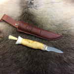 Poronsarvi/visakoivukahvainen sieniveitsi 5,5 cm:n ruostumattomalla terällä. Sienenmuotoisen kahvan päässä puhdistusharja. Sienikuvioitu tuppi, jossa kaulanauha.