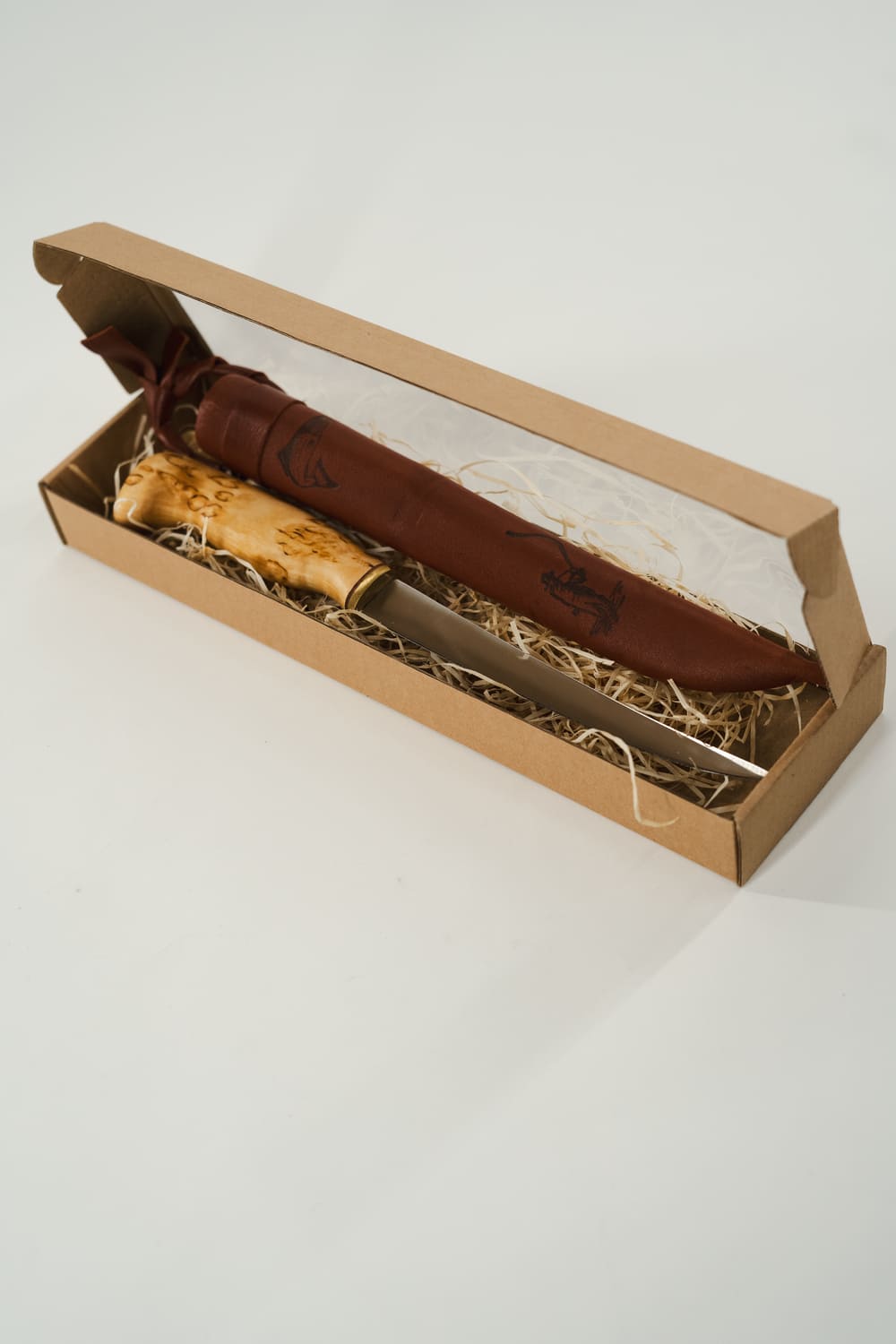 Poronsarvi/visakoivukahvainen fileerausveitsi ruostumattomalla 16cm terällä, sekä lohikuvioitu tuppi.
