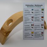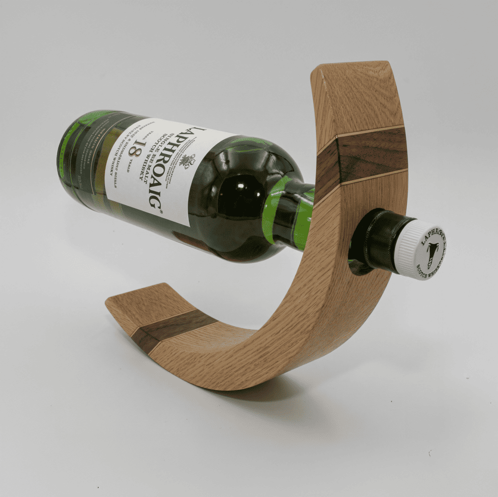 Koivusta valmistettu siro ja tyylikäs pulloteline visakoivuraidoin koristeltuna. Toimitus ikkunallisessa lahjarasiassa. Kotimaista käsityötä