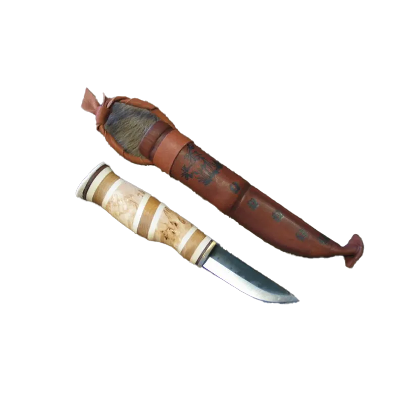 Jatka lukemista ”Puhelin / Tablettiteline”Lapinpuukko, jonka kahvassa käytetty haapaa, visakoivua, sekä lämpökäsiteltyä koivua. Kahvan päässä poronluuta. Terän pituus 7,7 cm.
