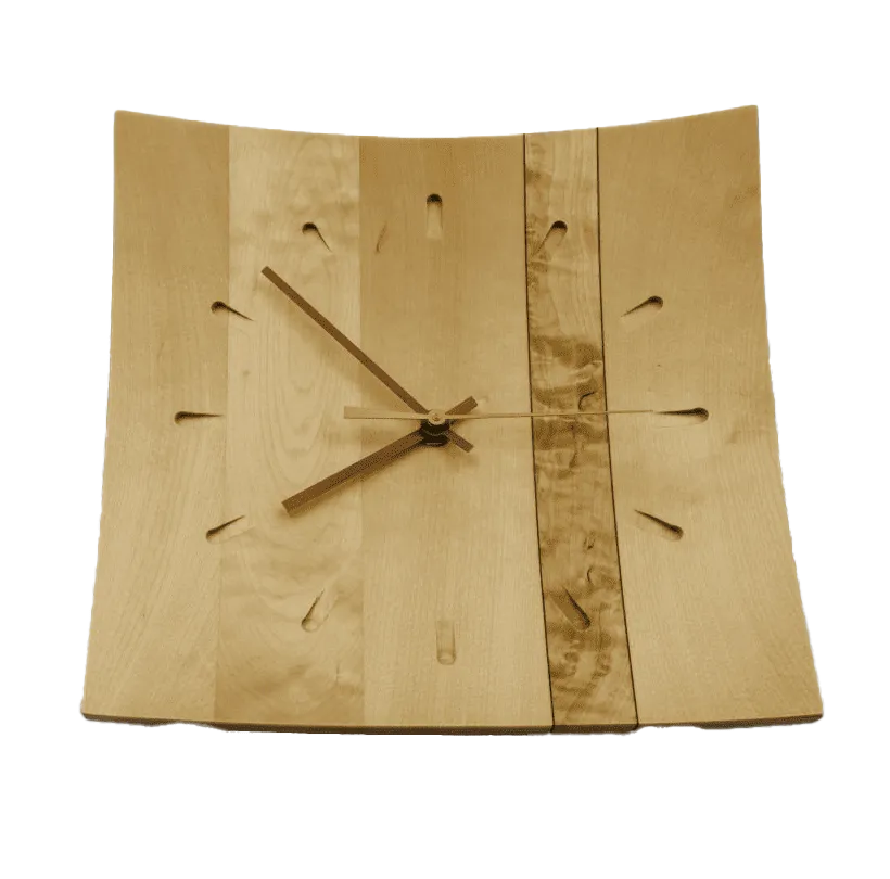 Koivusta valmistettu seinäkello visakoivuisella koristeraidalla. Saatavana kahta eri kokoa: 220mm x 220mm ja 250mm x 250mm. Kotimaista käsityötä